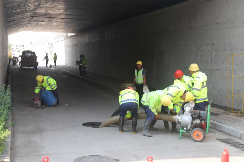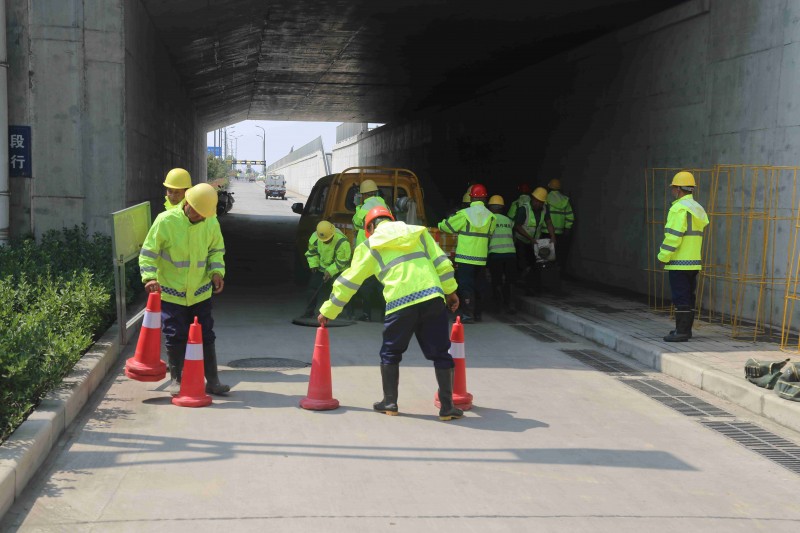 演練現(xiàn)場模擬特大降雨后,東海大道U型槽段周邊停電導(dǎo)致待焦鐵路立交雨水泵站無法正常使用,路面出現(xiàn)嚴(yán)重積水,最深處達(dá)到30cm,影響行車安全,車輛無法通行。面對突發(fā)險(xiǎn)情,市投資集團(tuán)防汛指揮部迅速啟動應(yīng)急預(yù)案,在U型槽路面最低處慢車道積水最低處雨水檢查井設(shè)置抽水泵,同時(shí)布置水帶繞過U型槽東側(cè)外墻至高位雨水檢查井,通過高位雨水管道將積水排放至山門河。